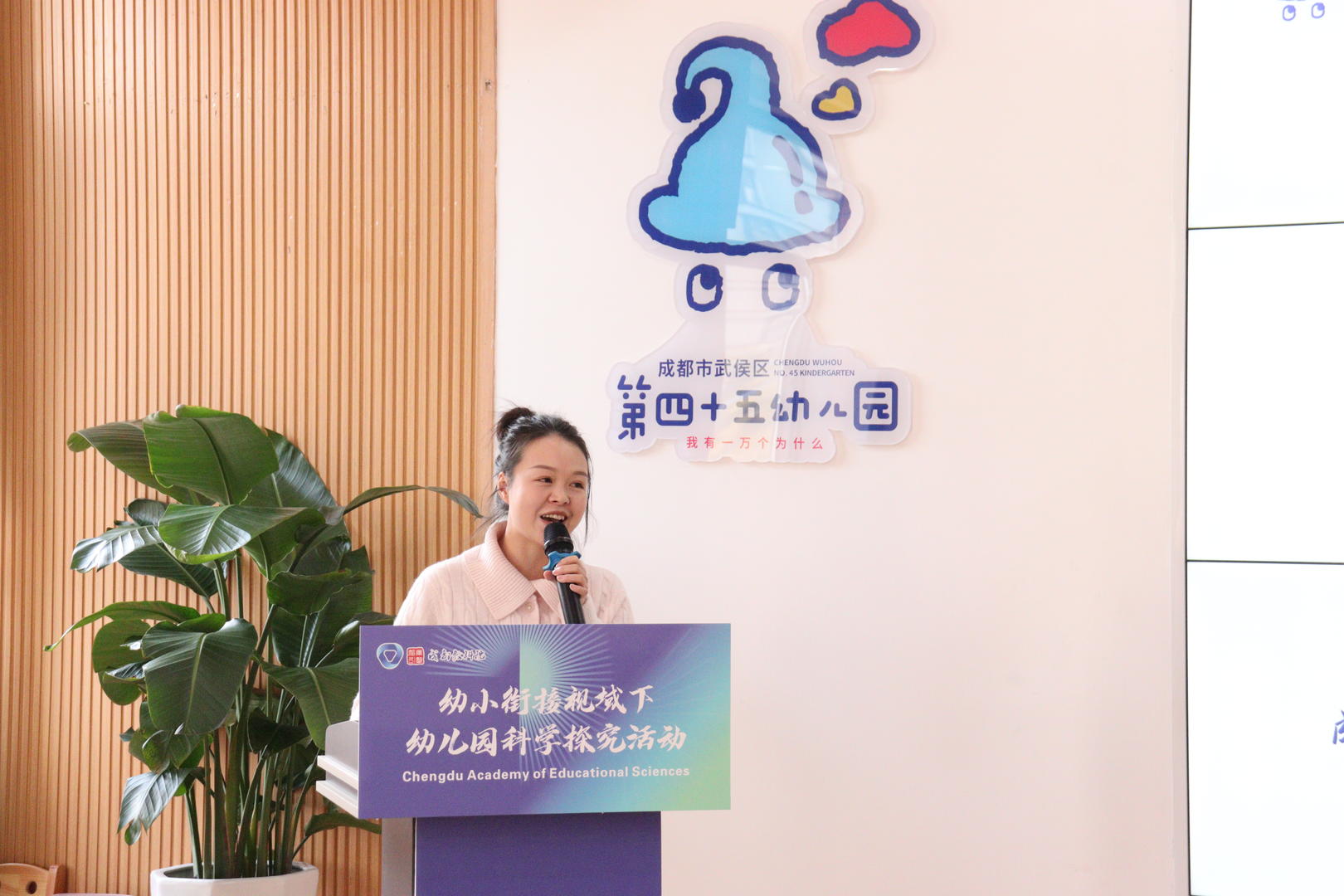 活动中,武侯区第四十五幼儿园党支部书记、园长吴三平专题汇报,介绍园所办园理念与课程建设路径。作为新建园,该园从筹备阶段就确立以问号为导向的办园价值追求,结合区位特点与政策文件研究,确定以科学为载体开展启蒙教育,致力于培养具备创新思维与内驱力的幼儿。