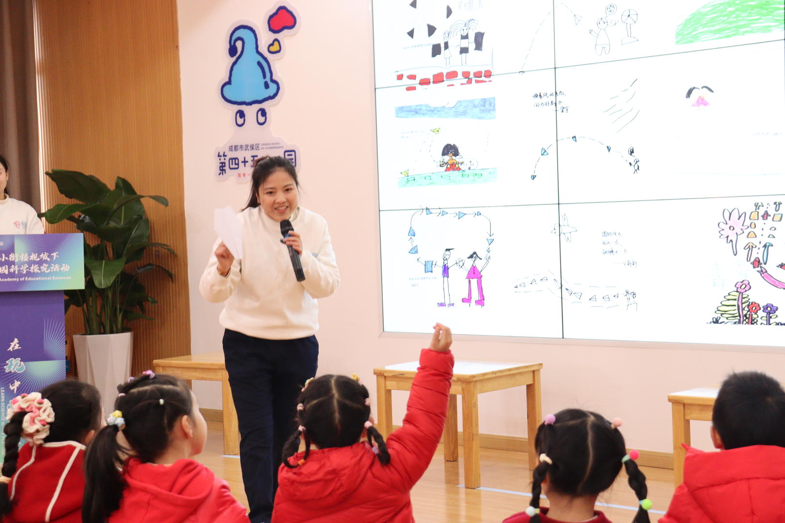 活动现场,武侯区第四十五幼儿园陈霞老师与孩子们带来科学探究活动《好玩的纸飞机》。在老师引导下,孩子们围绕纸飞机折法与飞行状态的关联大胆猜想、动手验证、清晰表达,相关发言赢得参会专家接连点赞。这堂课是该园科学启蒙教育的缩影,展现出幼儿在真实问题中完整的探究过程。